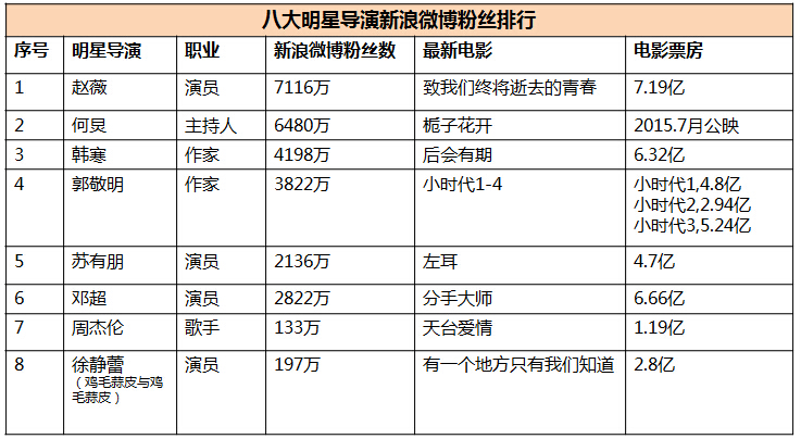 近幾年開始,無(wú)數(shù)的明星們搖身一變晉升電影導(dǎo)演,包括演員、歌手、作家,這好像也成為了娛樂(lè)圈之中的一大趨勢(shì),而且最重要的是他們領(lǐng)導(dǎo)的處女作都有著不錯(cuò)的票房,這里面對(duì)票房最大的貢獻(xiàn)我想應(yīng)該就是他們利用了互聯(lián)網(wǎng)時(shí)代的粉絲經(jīng)濟(jì),讓我們看一下近幾年新晉導(dǎo)演的票房成績(jī)和他們的微博粉絲數(shù)量。
