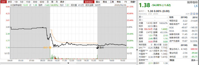 消息一出,開盤后瑞幸暴跌,連續(xù)六次觸發(fā)熔斷,最大跌幅超60%。最終收盤價為1.38美元/ADS,跌幅為54%。
