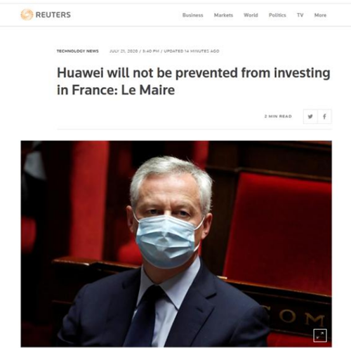 英國上周宣布將禁用華為后,其他歐洲國家對待華為的態(tài)度也受到關注。路透社21日最新消息說,法國財政部長勒梅爾當天表示,法國不會禁止華為在法投資5G。