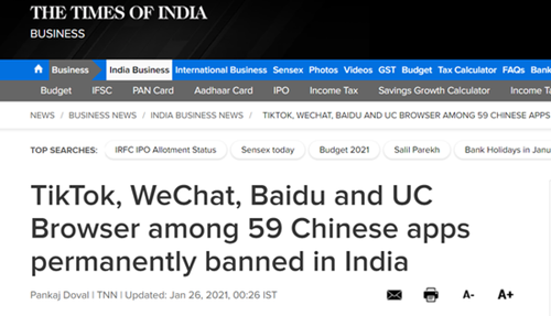 《印度時(shí)報(bào)》在報(bào)道中也提到此事稱,自去年6月起,印度政府已對267款應(yīng)用程序(不同批次)采取了“前所未有的”行動。印度電子信息技術(shù)部去年6月29日宣布,禁止包括TikTok、微信、微博在內(nèi)的59款中國應(yīng)用。7月28日,印度電子信息技術(shù)部稱印度政府已決定開展第二輪禁用中國網(wǎng)絡(luò)程序的決定,該禁令涉及47個(gè)中國公司開發(fā)的程序。同年9月2日,印度電子和信息技術(shù)部又發(fā)布公告,宣布禁用百度搜索等118款中國手機(jī)應(yīng)用程序。之后的11月24日,印度電子和信息技術(shù)部再次發(fā)布公告,宣布禁用全球速賣通、釘釘?shù)?3款中國背景手機(jī)應(yīng)用程序。