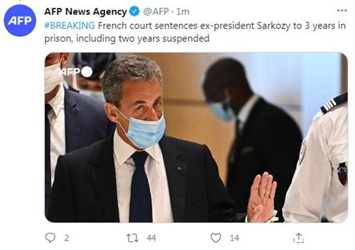 據(jù)法國BFMTV1日報道,檢方指控稱,薩科齊曾為法官阿齊貝爾提供高薪職位,以換取有關(guān)其非法接受政治資金援助案的內(nèi)部消息。1日,法國巴黎輕罪法庭裁決薩科齊犯有“貪腐”和“以權(quán)謀私”罪,因此判處他三年有期徒刑,其中兩年緩期執(zhí)行。
