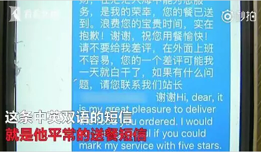 外賣小哥的送餐短信是中英文雙語(yǔ)的▼