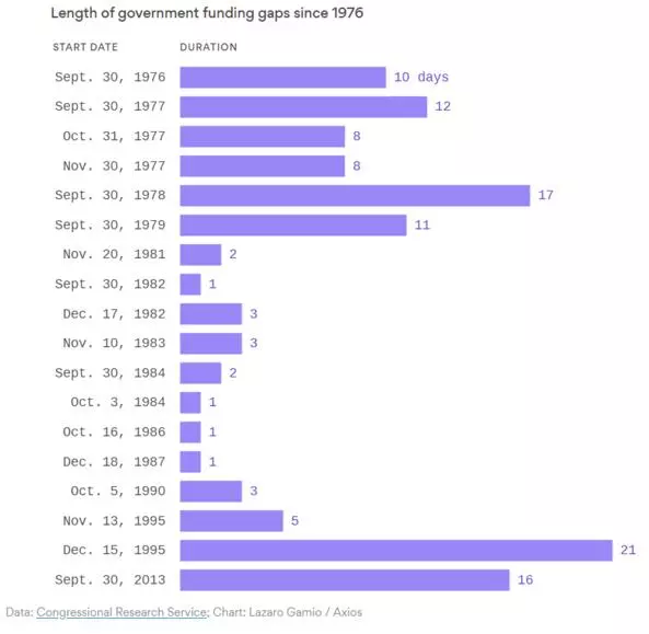 ▲1976年以來美國歷次政府關(guān)門時(shí)長(zhǎng)