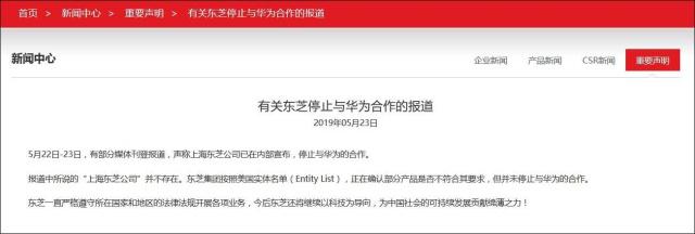 東芝中國官網(wǎng)23日發(fā)表一份聲明說,有部分媒體稱上海東芝公司已在內(nèi)部宣布停止與華為的合作,但報道中所說的“上海東芝公司”并不存在。東芝集團(tuán)“并未停止與華為的合作”。