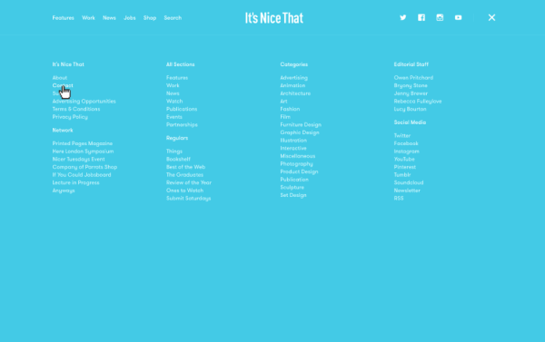 這種導(dǎo)航往往用的是 JS 語言排列布局,加上很多動效。這種方式往往會在一定程度上破壞可用性,但不得不說這會給人非常新穎的感覺。