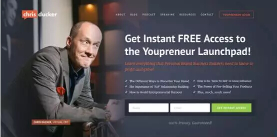 Chris的頁(yè)面設(shè)計(jì)做了較大更新。這個(gè)主頁(yè)的轉(zhuǎn)化率也非常高,這和主頁(yè)背景上Chris的眼睛一直望向郵箱地址填寫欄有關(guān)。稍后我們?cè)俜治鰹槭裁催@樣的背景圖片能夠提高轉(zhuǎn)化率。