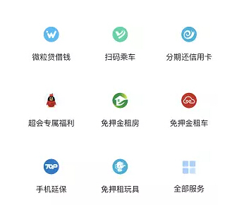 微粒貸借錢、掃碼乘車、分期還信用卡、超會專屬福利、免押金租房、免押騎摩拜、免押金租車、手機(jī)延保等眾多服務(wù)。