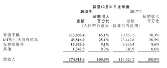 報(bào)告顯示,2018年小米手機(jī)業(yè)務(wù)收入人民幣1138億元,同比增長(zhǎng)41.3%;IoT與生活消費(fèi)品業(yè)務(wù)貢獻(xiàn)收入438億元人民幣,較去年同比增長(zhǎng)86.9%;互聯(lián)網(wǎng)服務(wù)業(yè)務(wù)收入160億元,同比增長(zhǎng)61.2%,占總體營(yíng)收的9.1%。分別在總收入中占比65.1%、25.1%和9.1%。